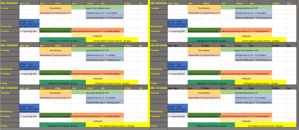 So, here is the new timetable for the next 6 weeks. We will take temperatures on arrival and provide hand sanitizer for everyone on arrival and departure. Inside we still have to adhere to the 2 metre rule and can therefore continue to only have 6 people in at a time.Outside we have to adhere to the 1 metre+ rule and so will have 2 areas – seating for up to 8 and activity sessions up to 15.Priority will be given to young carers and any young person we have identified as needing additional support, but other than this everything will be on a first come first served basis. We will also try to make sure that young people have at least one group per week available to them.The guidelines for us are different to school, so we will not be able to allow close contact at all – anyone not complying with this will be asked to leave.We will monitor how things go and make any changes needed along the way – this new world is throwing challenges continually, but we are trying to find the best way through