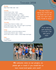 Check out our 2026 timetable for all regular groups and services. Please do get in touch if you have any questions. Referrals for 1:1 support and Family Support are currently closed whilst we catch up on the waiting list.